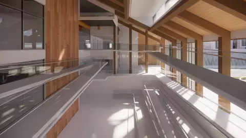 A hybrid mass timber construction is proposed for the new centre, with all below-grade structural elements constructed using non-combustible cast concrete, and all structural elements above level 2 constructed with mass timber.